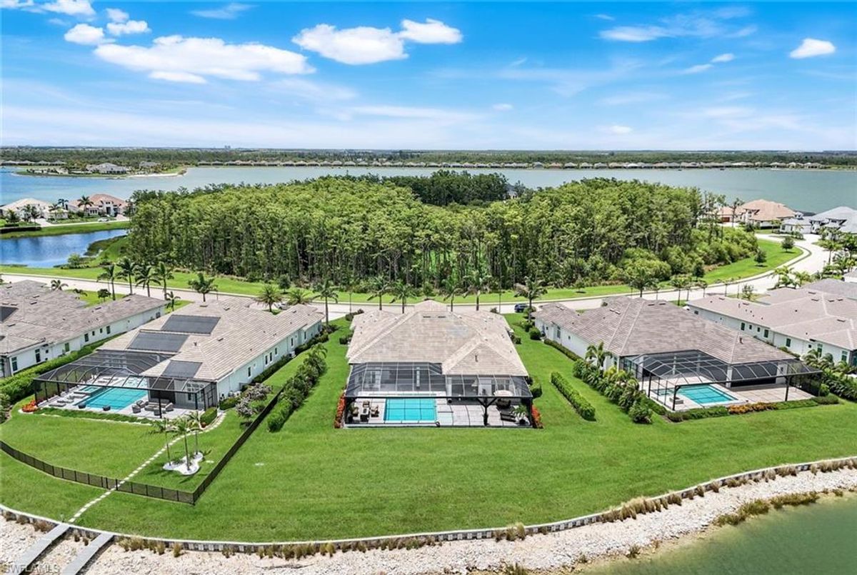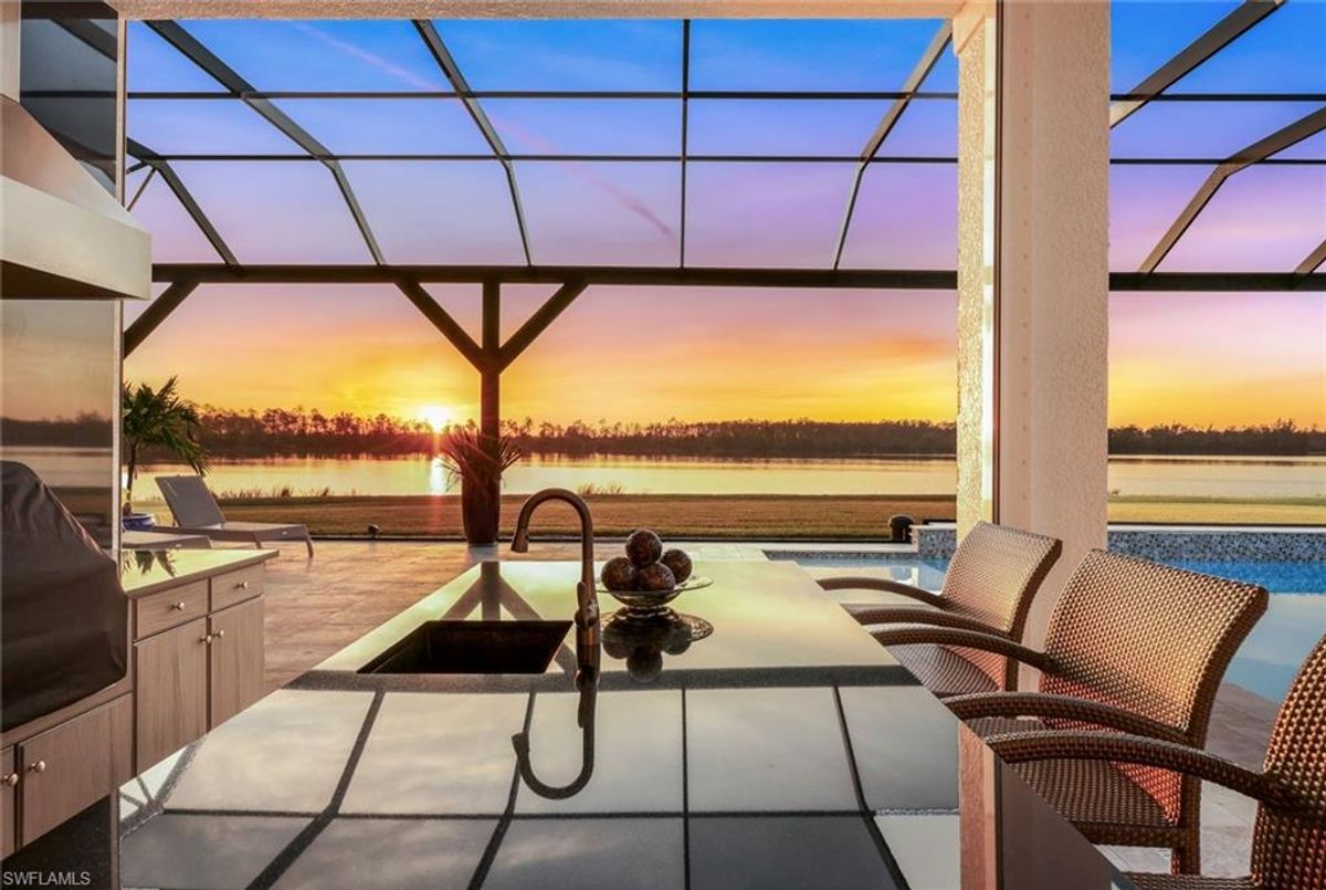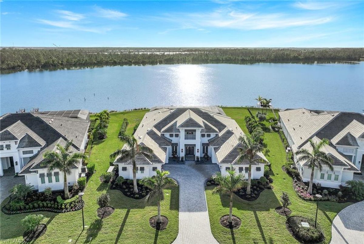 Welcome to this extraordinary Clairborne II custom estate by Stock Development, ideally positioned on one of the largest lakefront lots in the prestigious, resort-style community of WildBlue. This 4-bedroom, 4.5-bathroom residence with a bonus room, private den, and 4-car garage offers an impressive blend of sophistication, comfort, and design excellence.Step inside and discover soaring coffered ceilings, Italian porcelain and wood floors, and invisible surround sound speakers that create an ambiance of elegance throughout. The chef’s kitchen is a showstopper, featuring a Wolf gas range, Subzero appliances, 2” quartz countertops, and extensive custom cabinetry — perfect for everyday living and entertaining alike.Every bedroom is an en-suite retreat, offering privacy and luxury for guests and family. The primary suite is a sanctuary, complemented by stunning water views and spa-like amenities. Added conveniences include two tankless water heaters, 9-inch baseboards with integrated outlets, a 65 kW Kohler generator, and an oversized laundry room.The outdoor living space redefines Florida luxury: marble pavers, a custom saltwater pool, a gas fireplace, firepit, and a fully-equipped summer kitchen featuring an Alfresco grill with built-in grill, griddle, and smoker — an entertainer’s dream. With breathtaking views of WildBlue’s iconic big lake, the backyard becomes your private oasis — and yes, you can even add your own dock for boating, kayaking, or jet skiing right from your backyard.Furnishings are negotiable, and with Control4 Smart Home integration, this home offers seamless command of lighting, security, entertainment, and climate.WildBlue is a premier, gated community built around 800 acres of freshwater lakes. Residents enjoy access to a clubhouse with restaurant and bar, resort and lap pools, a fitness center and spa, 8 pickleball courts, tennis courts, walking trails, kayak and boat launch, and more.This is not just a home — it’s a lifestyle. Don’t miss this rare opportunity to own one of Fort Myers’ finest waterfront estates.