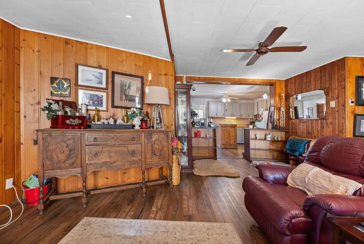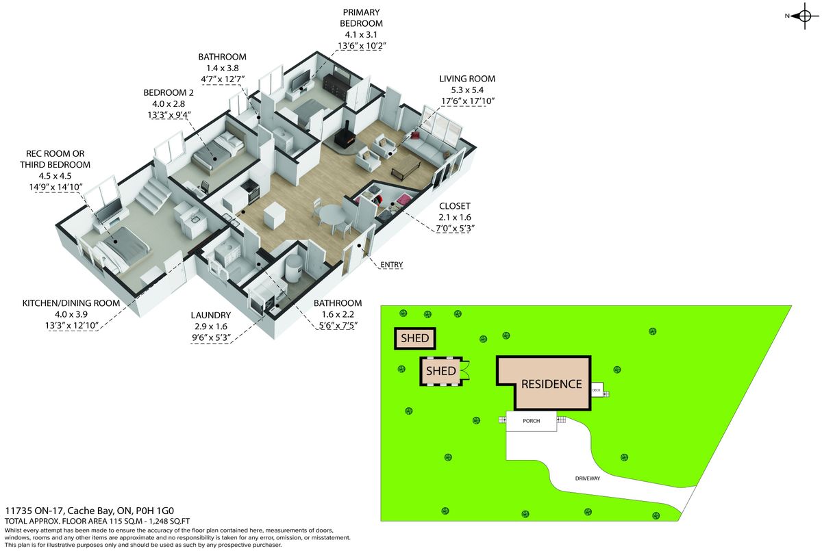 Welcome to 11735 Highway 17, a cozy two-bedroom, two-bathroom bungalow in the friendly community of Cache Bay. This single-story home offers the perfect mix of comfort and laid-back country vibes. As you roll down the driveway, you'll notice the welcoming front door leading into a comfortable living room, plus a convenient side entrance off the deck that takes you right into the eat-in kitchen. There's ample storage with a large closet and a handy laundry room flanking the deck entrance. The home features two bedrooms sharing a bathroom, with an extra bathroom attached to the kitchen area. Need extra space? There's a flexible room that can serve as a rec room or a third bedroom, complete with its own entry to the backyard. Enjoy cozy evenings by the pellet stove in the living room, a perfect spot for relaxation. Outside, you'll find a spacious yard with practical storage sheds, perfect for all your outdoor gear or gardening tools. Cache Bay is a welcoming community offering natural beauty and a peaceful lifestyle. Whether you're looking for a starter home, downsizing, or seeking a retreat, this charming bungalow could be just what you need.