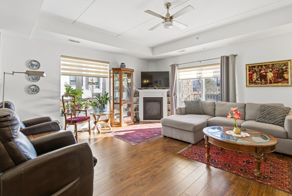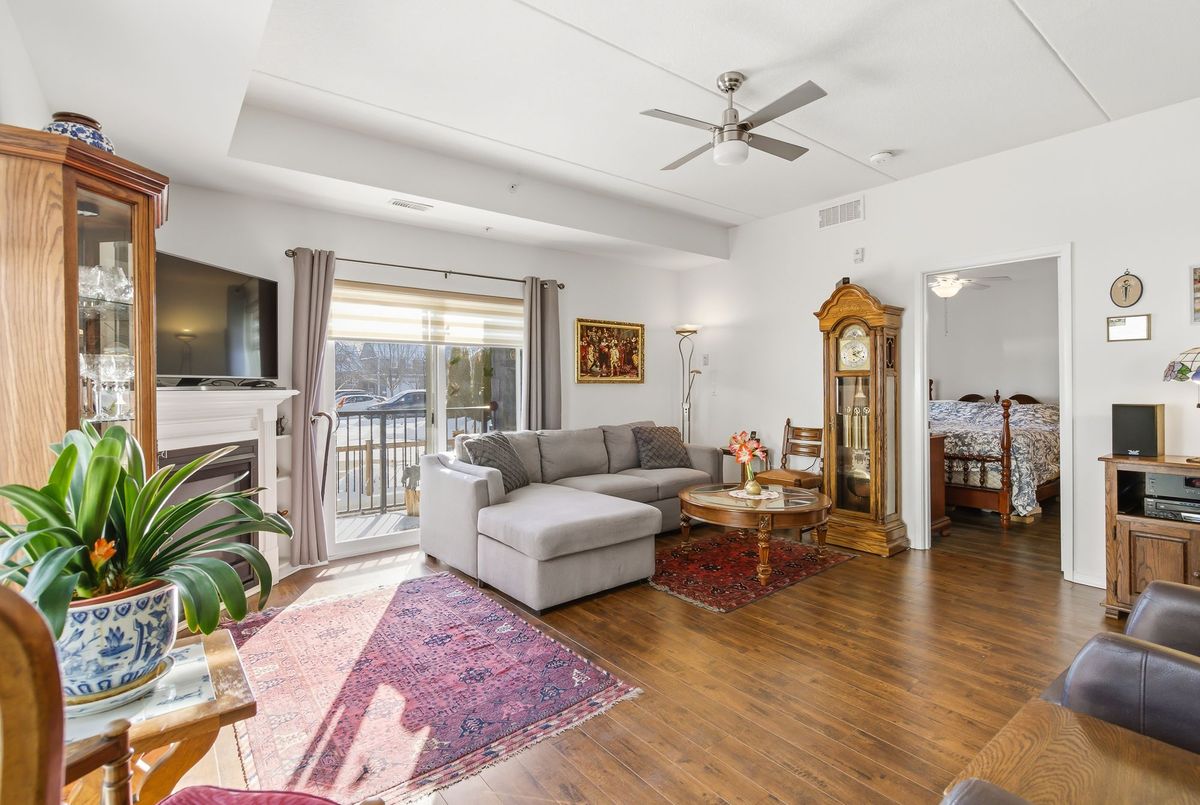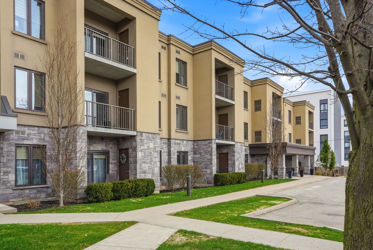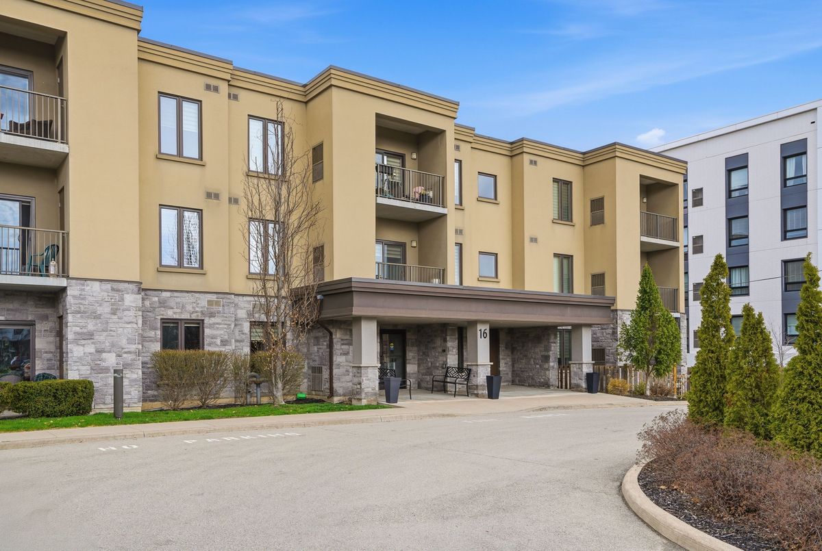 Walk right into your condo with no need to use the elevator! Convenient main floor 2 bedroom, 2 bath accessible condo over 1,100 square feet! Wonderfully kept and cared for by the owners since new in 2016. Wonderful natural light shines into this South-East exposure corner unit. Open design living area with white & bright kitchen with plenty of cabinets and counter-space with adjacent dining room area. Spacious living room with corner gas fireplace. Sliding patio doors to balcony - perfect for a morning coffee and a relaxing afternoon book read. Private split-bedroom layout with primary bedroom ensuite with easy step-in shower. The 2nd bedroom is currently used as a den and has an adjacent 3 piece bath with accessible step-in jetted bathtub. Laundry room with convenient stack-able washer and dryer and laundry tub. Includes central air, owned hot water tank, forced-air gas furnace, one surface parking space, private locker plus common area room for additional patio furniture and bike storage. This exceptionally maintained building also offers a large social room with kitchen and bathroom, exercise room, and a craft & hobby room. And for the spring to fall months you can enjoy the outdoor space with gazebo and bbq area. Condo fees are keep very reasonable by having no costly pool or underground parking to maintain. A great quiet neighbourhood too - just a short walk to shopping, groceries, pharmacy, dining, churches, transit plus quick access to highway 58, the 406 and onwards to the QEW and all that Niagara has to offer!